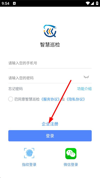 1、進入智慧巡檢界面,有輸入手機號、密碼的輸入框,配備忘記密碼、功能介紹選項,需勾選服務協議與隱私協議,同時提供企業注冊、登錄及指紋、微信登錄方式。