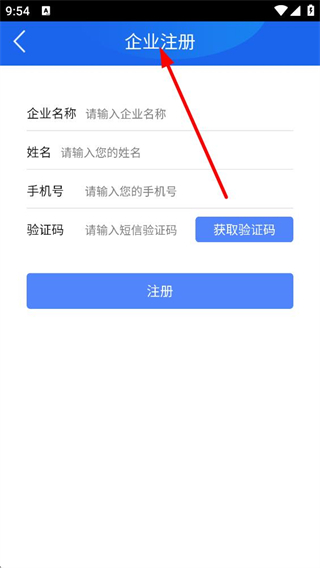 2、點擊企業注冊進入對應界面,需依次填寫企業名稱、姓名、手機號,獲取并輸入短信驗證碼后,點擊注冊按鈕即可完成企業注冊操作。