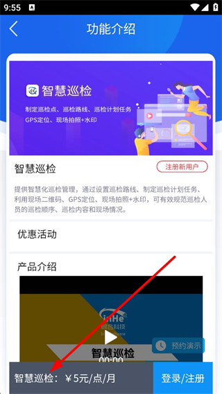 4、進入功能介紹界面,可了解智慧巡檢的管理功能,還能查看優惠活動、產品介紹,知曉其收費標準,也可進行登錄注冊或預約演示。
