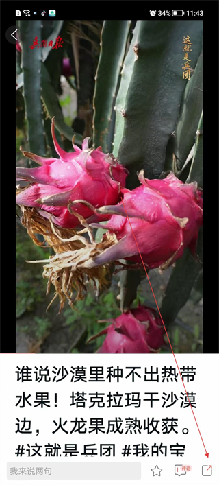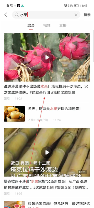 3、在搜索結果中選擇火龍果相關的資訊視頻,點擊進入該視頻的播放詳情頁面閱讀,還可以點擊下方的分享按鈕。