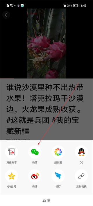 4、在視頻詳情頁點擊分享按鈕,在彈出的選項中選擇微信渠道,將這條資訊視頻分享給好友。