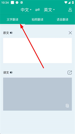 1、進入翻譯APP文字翻譯頁面,可選擇中文與英文互譯,原文框輸入文字,譯文框會呈現翻譯結果,還可使用拍照翻譯、語音翻譯功能。