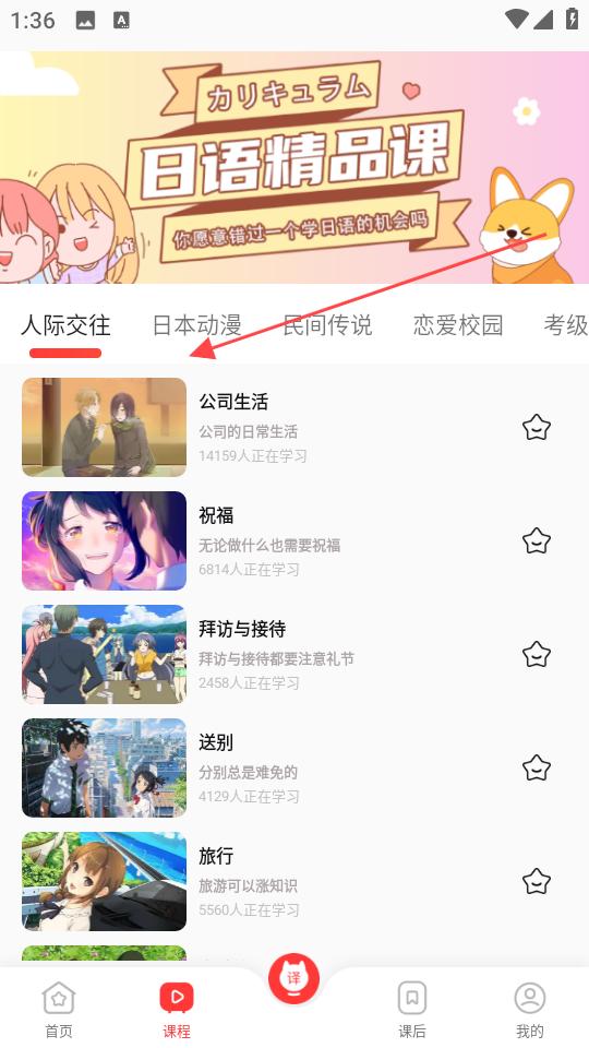 2、課程界面,展示了人際交往、日本動漫等不同分類的日語課程,用戶可選擇適合自己的課程進行學習,方便用戶拓展日語知識。