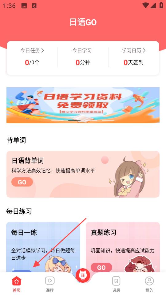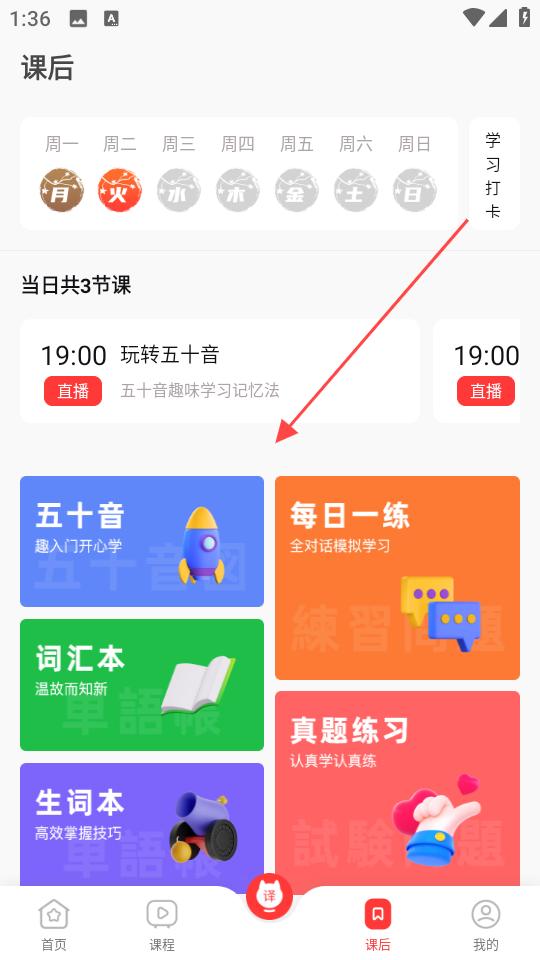 3、課后界面,展示了當日的課程安排和課后練習功能入口,用戶可進行學習打卡和課后練習,方便用戶鞏固日語知識。