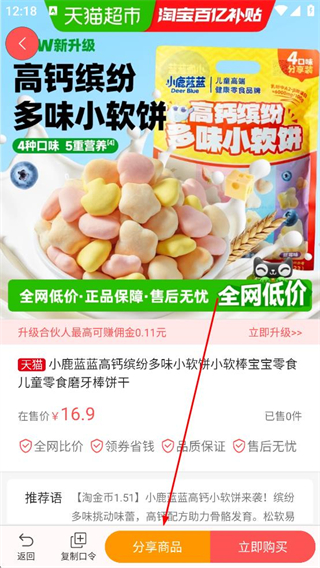 3、在商品詳情頁查看價格及推薦語等內容,找到分享商品按鈕,點擊該按鈕彈出分享平臺選擇界面。