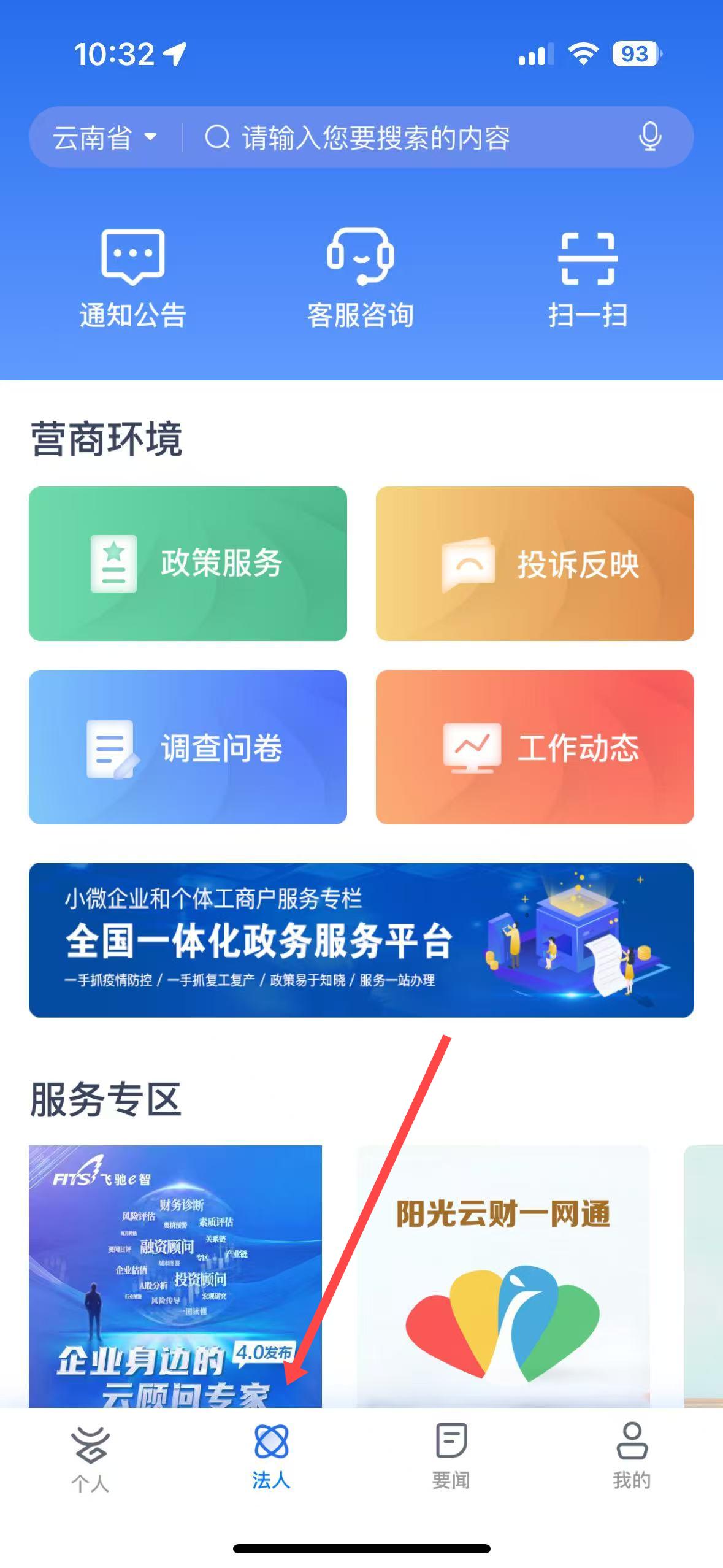 2、法人界面,有通知公告、客服咨詢等功能入口,展示了營商環境和服務專區的相關內容,方便企業用戶了解和使用政務服務。