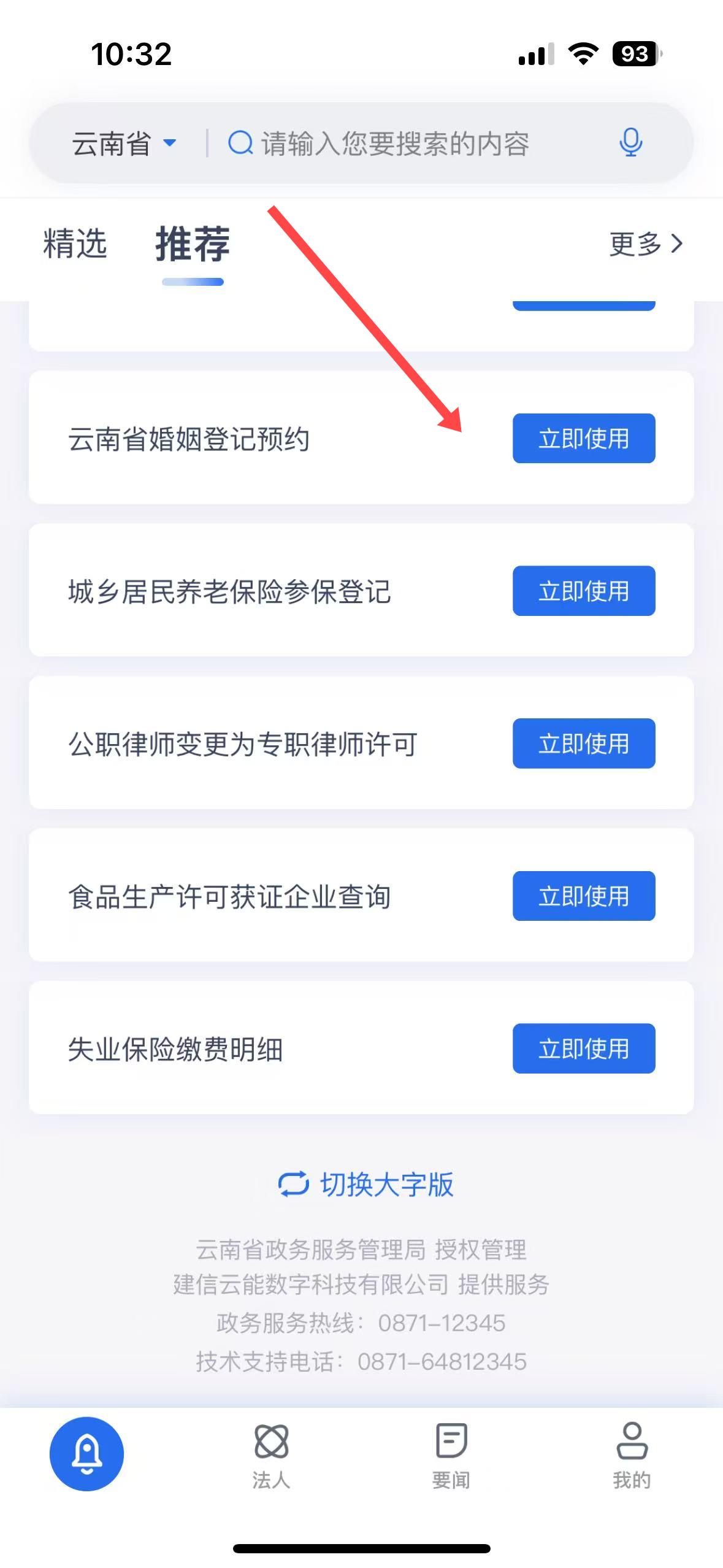 3、推薦界面,展示了云南省婚姻登記預約、城鄉居民養老保險參保登記等服務內容,用戶可點擊立即使用按鈕使用相關服務。