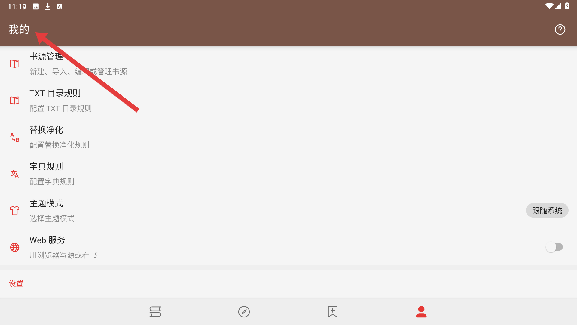4、進入我的界面,可進行書源管理、TXT目錄規則配置等操作,還可設置主題模式、Web服務等,個性化定制閱讀體驗。