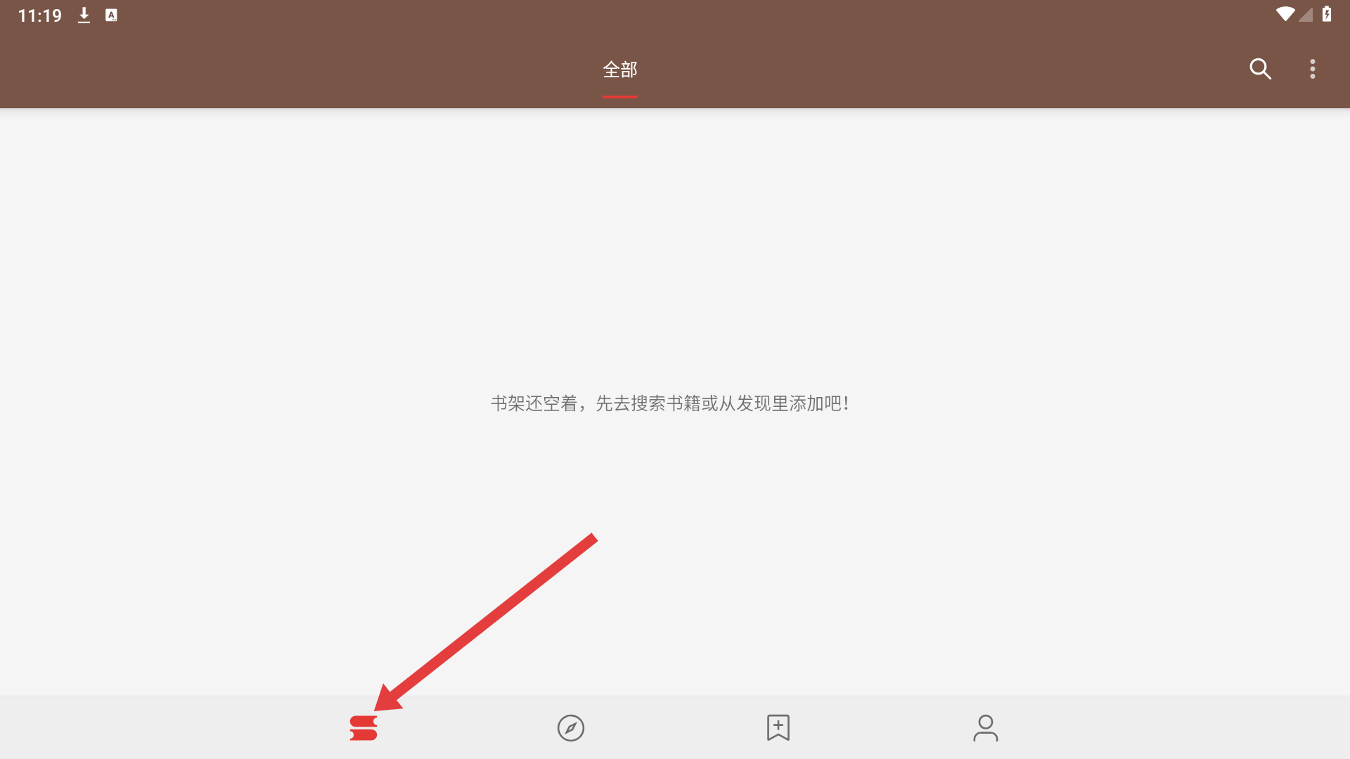 1、進入APP書架界面,若書架為空,可點擊下方功能按鈕進行書籍添加操作。