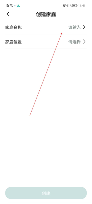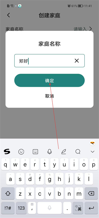 3、在創建家庭頁面點擊家庭名稱對應的輸入區域,彈出輸入窗口,在輸入框中填寫家庭名稱,完成后點擊確定按鈕保存內容。