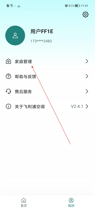 1、打開飛利浦空調APP進入我的頁面,找到家庭管理選項并點擊,進入創建家庭頁面,準備進行家庭信息的設置。