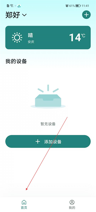 4、創建家庭后進入首頁,可查看當前的天氣信息,在我的設備板塊點擊添加設備按鈕,準備添加飛利浦空調設備進行管理。