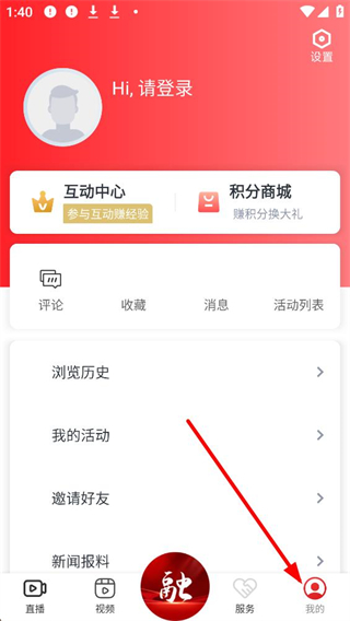 2、點擊底部我的按鈕,進入個人界面,可看到互動中心、積分商城等功能入口,還有評論、收藏、消息等操作選項,未登錄時會提示Hi,請登錄。