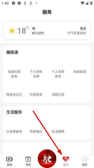 4、點擊底部服務按鈕,進入服務界面,可查看南昌天氣信息,使用贛服通的省直社保查詢、個人完稅證明等服務,還有生活服務中的火車票查詢、生活繳費等功能。