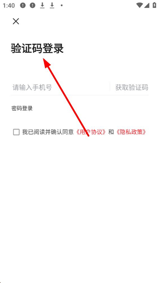 3、登錄界面,可選擇驗證碼登錄,輸入手機號獲取驗證碼,也可選擇密碼登錄,登錄前需勾選同意用戶協議和隱私政策。