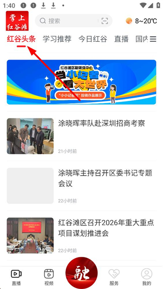 1、進入APP首先看到紅谷頭條界面,展示紅谷灘區各類新聞資訊,如考察、會議動態等,還可切換學習推薦、今日紅谷等板塊瀏覽內容。