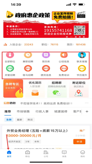 1、首頁聚合全部職位、兼職招聘等求職入口,含急聘專區、優化簡歷服務,展示政物府惠企政策,是求職與企業服務的綜合入口。