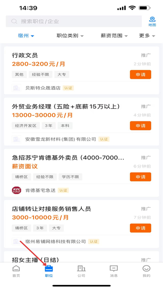 2、職位界面展示宿州地區各類職位信息,支持按地區、類別、薪資篩選,標注薪資、經驗要求,用戶可直接申請崗位。