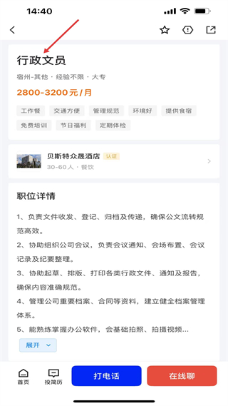 3、職位詳情界面呈現崗位薪資、福利、企業信息,展示職責與要求,提供打電話、在線聊功能,助力了解崗位對接企業。