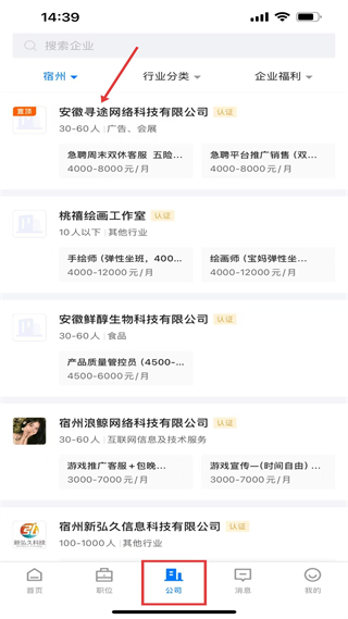 4、公司界面展示宿州地區認證企業列表,按行業分類呈現,關聯招聘崗位,便于用戶了解企業并查看對應職位。