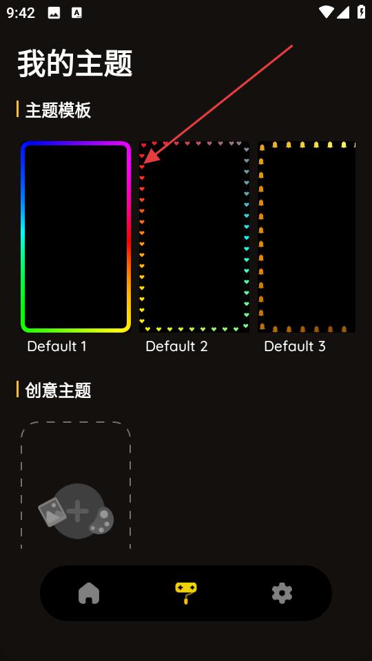 1、我的主題界面,展示了多種主題模板,用戶可選擇不同的主題模板來個性化自己的界面,底部的導航欄方便用戶切換到首頁。