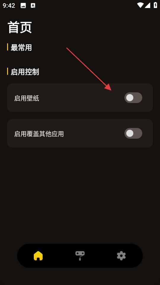 2、首頁界面,展示了最常用和啟用控制兩個板塊,用戶可在啟用控制板塊中開啟或關閉啟用壁紙和啟用覆蓋其他應用的功能。