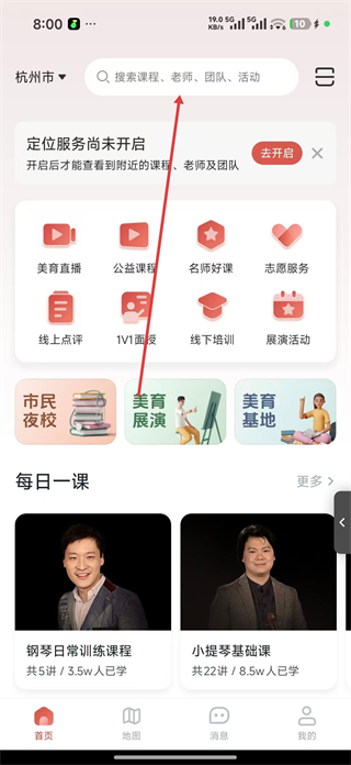 2、首頁有美育直播、公益課程等功能入口,可搜課程老師,開啟定位查附近資源,豐富學習。