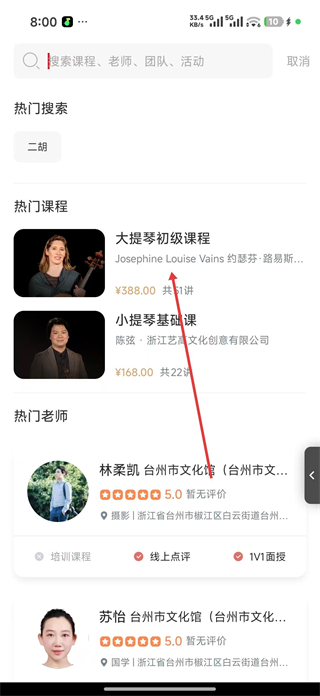 3、在搜索結果頁查看熱門課程列表,選擇目標課程如大提琴初級課程,點擊進入該課程的詳情頁面,查看課程信息。