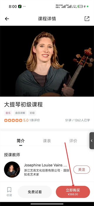 4、在課程詳情頁查看課程簡介授課教師等內容,可選擇免費試看體驗課程,也能點擊立即購買按鈕,完成課程的購買。