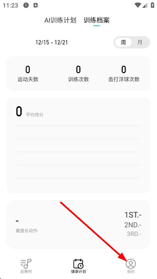 1、進入POPFit的訓練檔案頁面,可查看運動天數、訓練次數等數據,點擊底部我的按鈕,可進入個人中心頁面。
