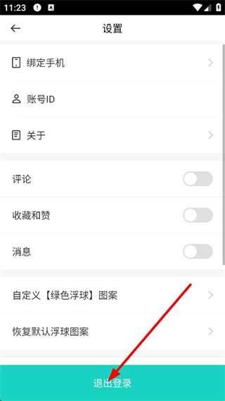3、進入設置頁面,有綁定手機、賬號ID等功能選項,還可設置評論、收藏和贊等功能的開關,底部有退出登錄按鈕,點擊可退出當前賬號。