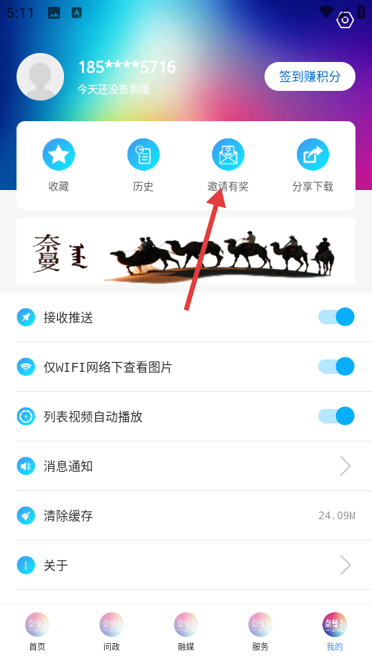 2、登錄完成后在我的頁面中,你可以看到自己的賬號信息,還有收藏、歷史等功能入口,若要邀請好友找到邀請有獎按鈕并點擊,進入邀請好友頁面。