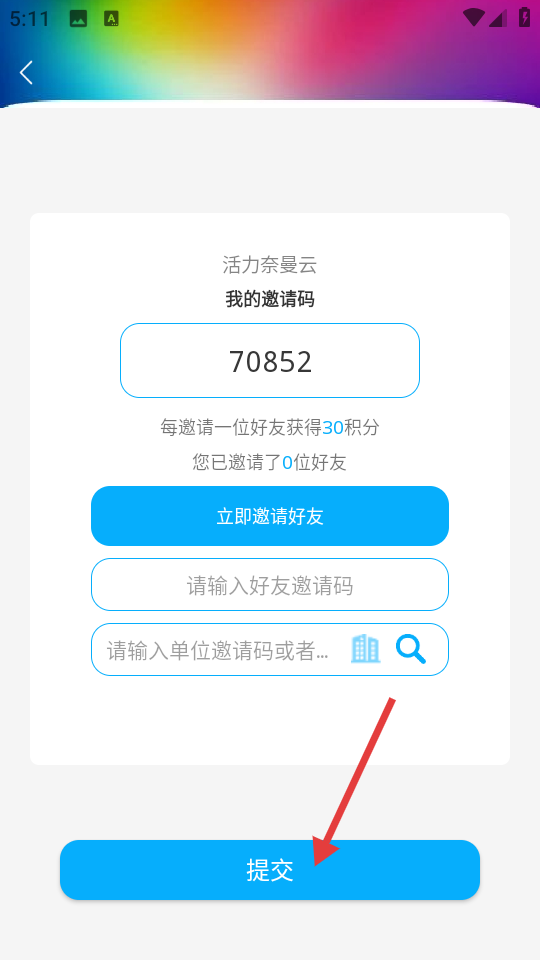 3、進入邀請好友頁面后,點擊立即邀請好友按鈕,將邀請碼分享給好友,若好友有邀請碼也可以在相應輸入框中輸入好友邀請碼,輸入完成后點擊提交按鈕。