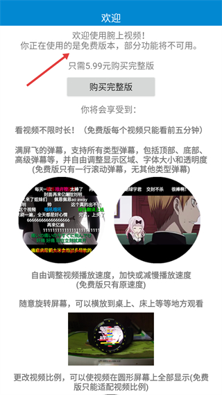 1、腕上視頻歡迎頁,免費版部分功能不可用,5.99元購完整版可享看視頻不限時、滿屏彈幕、調播放速度等功能。