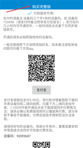 2、購買完整版頁,需備注設備碼支付,付款后截圖發作者,1-2日內開通,保存設備碼可恢復付費狀態。