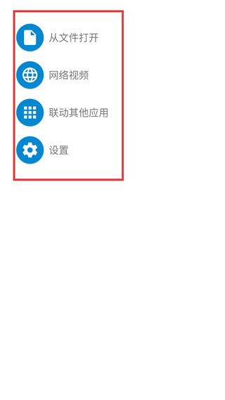 3、功能入口頁,有從文件打開、網絡視頻、聯動其他應用、設置等選項,方便選擇視頻來源和設置功能。