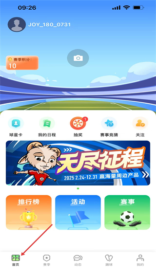 1、首頁展示賽季積分,有球星卡、我的日程等功能,還有無盡征程活動和排行榜、活動、賽事分類,內容豐富,滿足足球愛好者多樣需求。