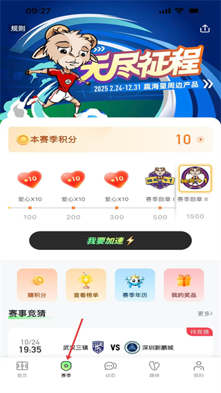 2、賽季板塊顯示本賽季積分,可獲取愛心、賽季勛章,還有賽事競猜,助力用戶參與賽季活動,提升參與感與互動性。