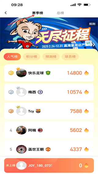 3、賽季榜有積分、預測等榜單,展示用戶人氣排名,如快樂足球、梅西等位列前茅,增加競技趣味性,激發用戶競爭欲。