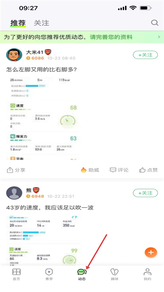 4、動態板塊有用戶分享的運動動態,可關注、助威、評論,是足球愛好者交流運動心得的平臺,互動性強。