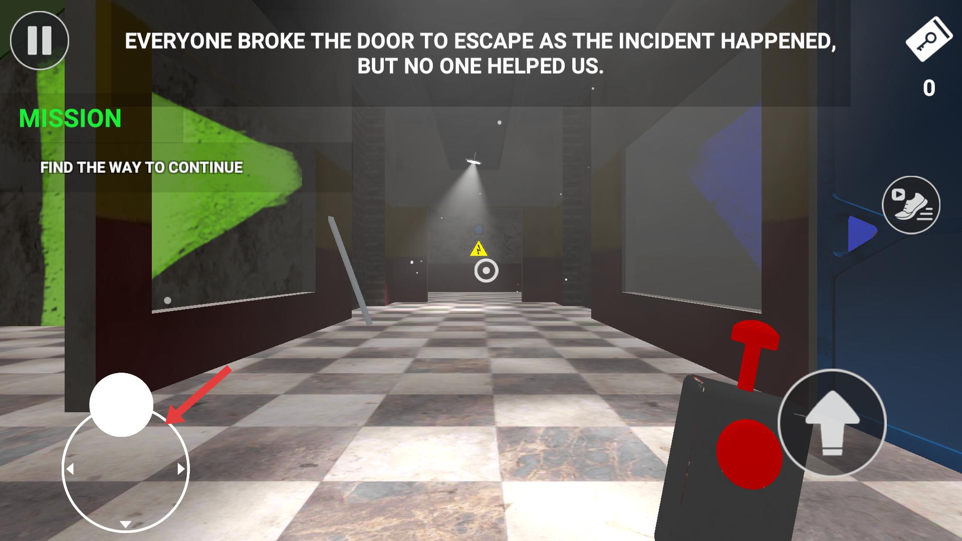 3、互動后,利用左側虛擬搖桿控制角色移動,在走廊中探索,尋找能繼續前進的路徑,同時留意上方的劇情文字和任務提示。