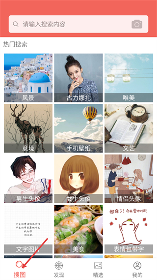 1、搜圖板塊,有搜索欄和熱門搜索分類,涵蓋風景、明星等壁紙,還有頭像、文字圖片、美食、表情包等類別,滿足多樣搜圖需求。