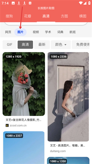2、圖片搜索結果板塊,可切換搜索源,有圖片等分類,展示高清文藝圖片,如鮮花人像、光影人像,提供尺寸和來源信息。