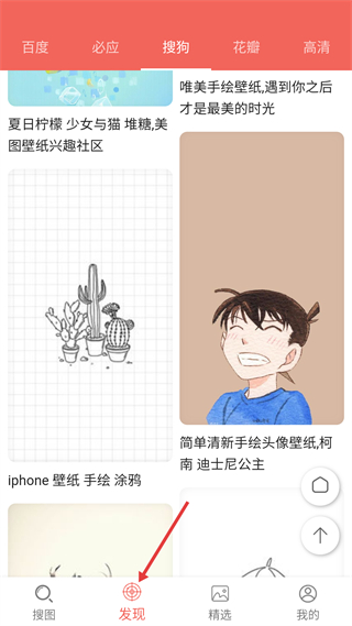 4、發現板塊,可切換搜索源,展示手繪、動漫頭像等壁紙,如仙人掌手繪、柯南頭像,助發現特色壁紙。