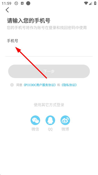 4、登錄界面輸入手機號,同意用戶服務協議和隱私協議后可進行下一步操作,也可選擇微信、QQ、微博第三方登錄方式。