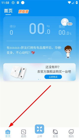 1、進入首頁可查看體重、脂肪率等身體數據,還有燃脂營入口,底部有首頁、趨勢、上秤、發現、我的導航選項,若沒有秤可前往官方旗艦店購買。
