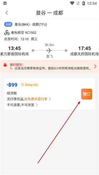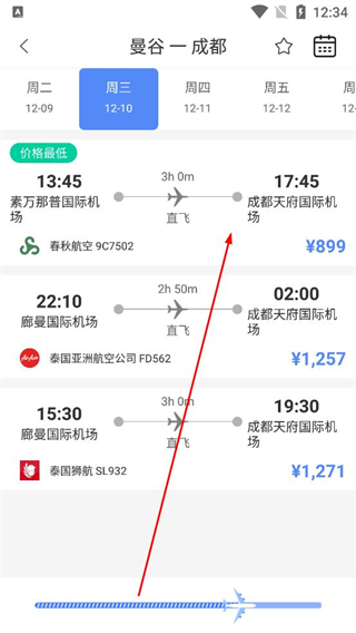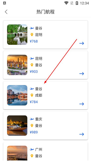 2、在熱門航程頁面選擇曼谷到成都的航線,點擊進入該航線的航班列表頁面,查看不同航班信息。