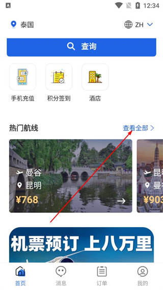 1、打開軟件進入首頁,選擇熱門航線板塊的查看全部選項,進入熱門航程頁面,瀏覽各類航線信息。