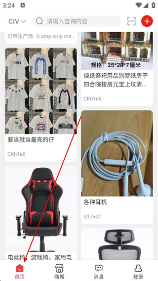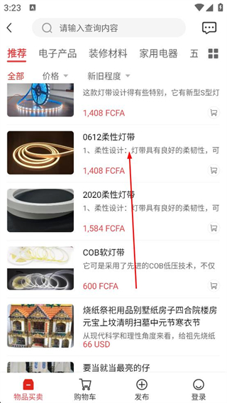 2、登錄后進入首頁,瀏覽各類商品展示,切換至電子產品分類,查看展示的燈帶等商品,選擇目標商品進入詳情頁。