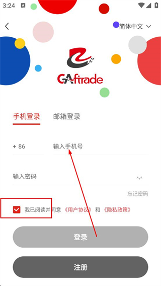 1、打開平臺進入登錄頁面,選擇手機登錄,輸入手機號及密碼,勾選同意相關協議,準備完成登錄。